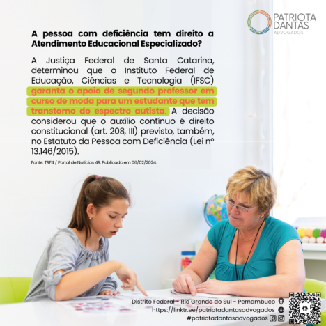É direito assegurado pela Constituição Federal e pelo Estatuto da Pessoa com Deficiência, ter acesso a profissional de Atendimento Educacional Especializado em instituições públicas e privadas, em todos os níveis…